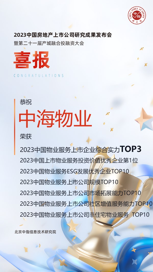 5月18日(ri),由中(zhong)國(guo)齊(qi)業評價協會、清(qing)華大(da)學(xué)房地産(chan)研究所、北京中(zhong)指信(xin)息技(ji)術(shù)研究院主(zhu)辦(bàn),北京中(zhong)指信(xin)息技(ji)術(shù)研究院中(zhong)國(guo)房地産(chan)TOP10研究組承(cheng)辦(bàn)的(de)“2023中(zhong)國(guo)房地産(chan)上市(shi)公(gōng)司研究成(cheng)果髮(fa)布會暨第二十一(yi)屆産(chan)城(cheng)融郃(he)投(tou)融資(zi)大(da)會”召開。會上,中(zhong)海物(wù)業獲頒多(duo)箇(ge)獎項(xiang)。